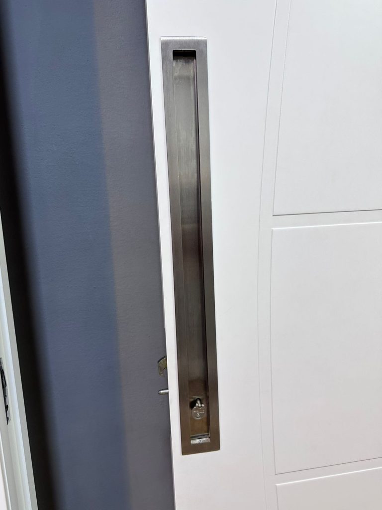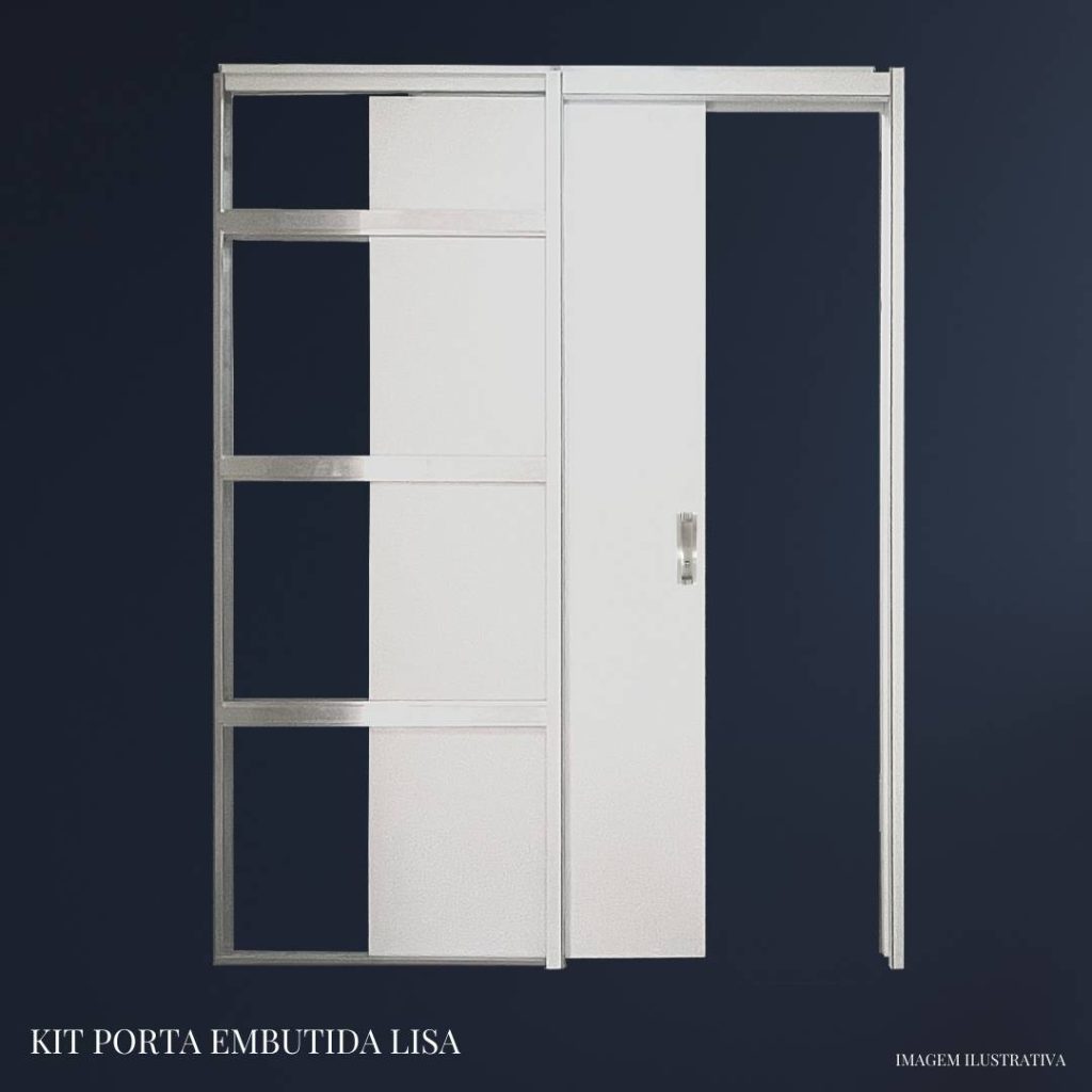 É um kit completo composto por uma folha de porta sem detalhes ou frisos (superfície lisa), ferragens ocultas e uma estrutura metálica que permite que a porta “suma” dentro da alvenaria ou do drywall. O acabamento branco costuma ser em polímero ou pintura eletrostática, garantindo uniformidade visual com as paredes.